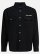 Giacca overshirt con stampa Human Made realizzata in twill di cotone spesso e resistente. La costruzione presenta una struttura dritta con silhouette rilassata. Sul petto sinistro è applicata una tasca con bottone decorativo a forma di cuore e ricamo a catena sopra la tasca. Toppe rinforzate sono posizionate sui gomiti di entrambe le maniche. Una stampa grafica occupa il retro.
