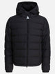 Piumino corto "Laveraet" Moncler, costruito con guscio esterno e fodera in poliestere e imbottitura interna. La struttura presenta cappuccio regolabile dotato di cinturini con dettaglio logo, chiusura frontale con zip e tasche laterali con cerniera. Il fondo del capo è regolabile tramite coulisse. Il taglio regolare segue una silhouette boxy con spalle e torace aderenti, enfatizzando una linea compatta e definita.