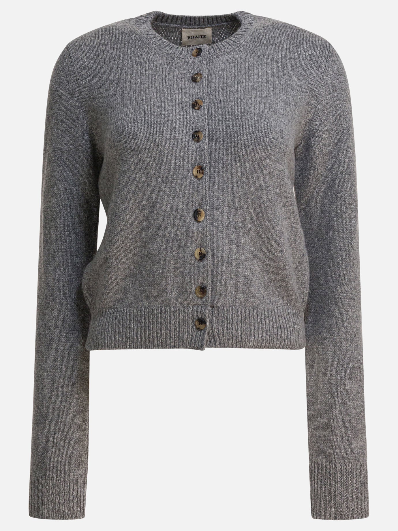 Cardigan "Everheart" Khaite, realizzato in puro cashmere con struttura lavorata a maglia compatta. Presenta costruzione regolare con silhouette leggermente cropped, girocollo definito e finiture a costine su orlo e polsi. Chiusura frontale con bottoni tartarugati. Le maniche lunghe contribuiscono a una linea essenziale e funzionale, completata da dettagli visibili nelle cuciture e dal taglio pulito dei bordi.