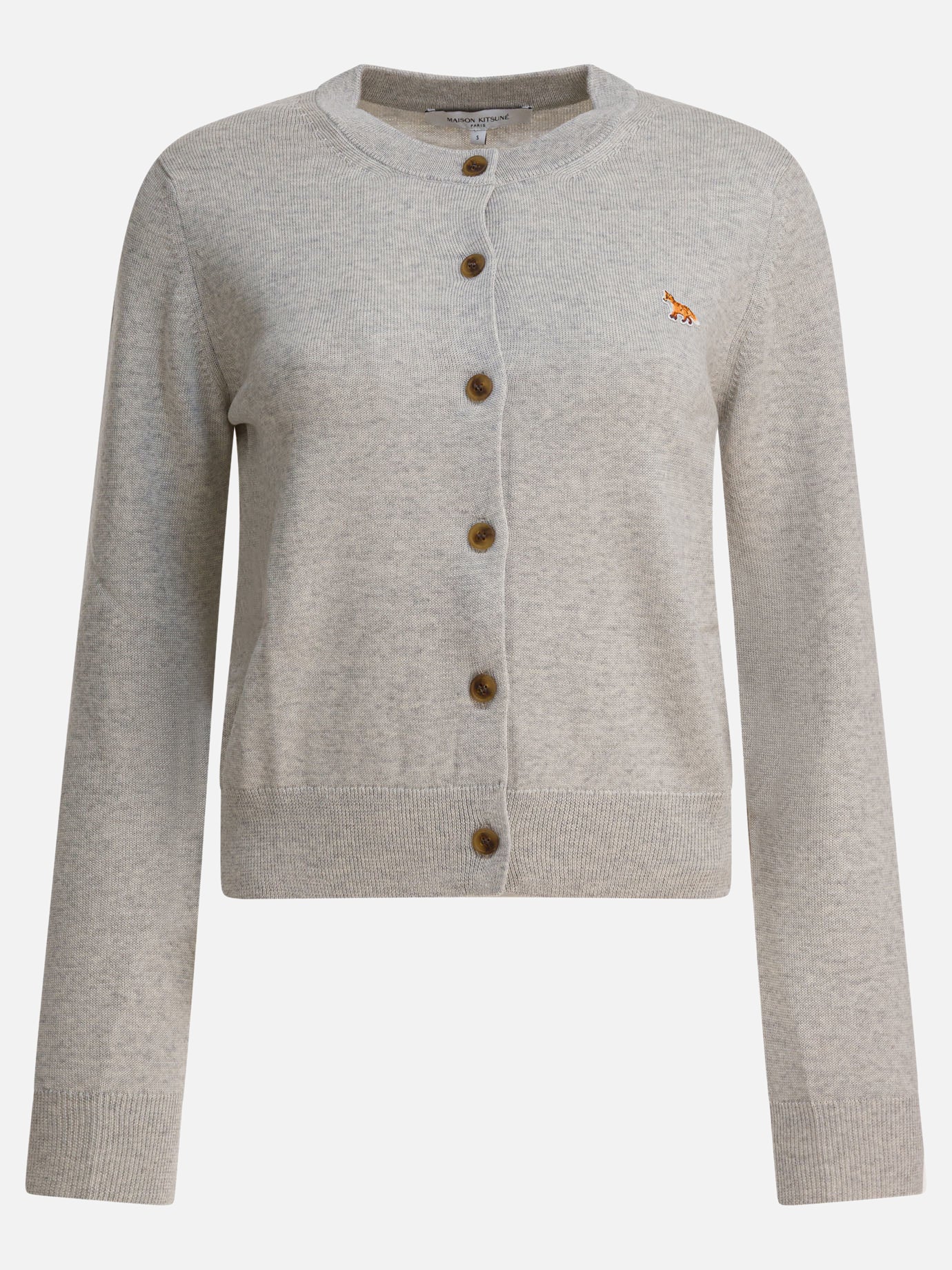 Cardigan "Baby Fox" Maison Kitsuné realizzato in lana merino extra fine, con tessitura compatta e struttura a maglia uniforme. Presenta silhouette regolare a girocollo e maniche lunghe. Chiusura frontale a bottoni personalizzati Maison Kitsuné, rifinitura a costine su scollo, polsini e orlo. Una toppa con ricamo Baby Fox è applicata sul petto, aggiungendo un elemento identificativo del brand.