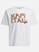 Kapital "Canoe Kapital" T-shirt features cotton construction, regular silhouette and ribbed crew neck. The front shows the KAP][TAL logo print, inspired by the leather labels on Kapital jeans. The print, composed of distinctive graphic characters, includes an outward-facing parenthesis and a stylized "L" to resemble a canoe, details that contribute to the garment's visual identity. Uniform surface finishing.