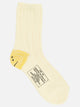 Kapital "Rainbowy Happy Heel" socks made from a blend of cotton, polyester, and polyurethane. The structure features a classic silhouette with stencil pattern integrated into the workmanship. The heel shows multicolored pattern work, applied by inlay. The knit construction ensures stretch and stability, while flat finishes reduce thickness at the toe and heel.