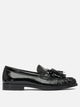 Alohas "Marietta Patent" loafers, made entirely of patent leather with a crinkled surface and glossy finish. The upper features a compact construction with applied fringing on the front and penny tab detail. The silhouette features rounded lines and a low heel, offering structural solidity and a flat sole. Decorative elements are integrated into the supporting structure of the shoe, ensuring aesthetic and functional consistency.