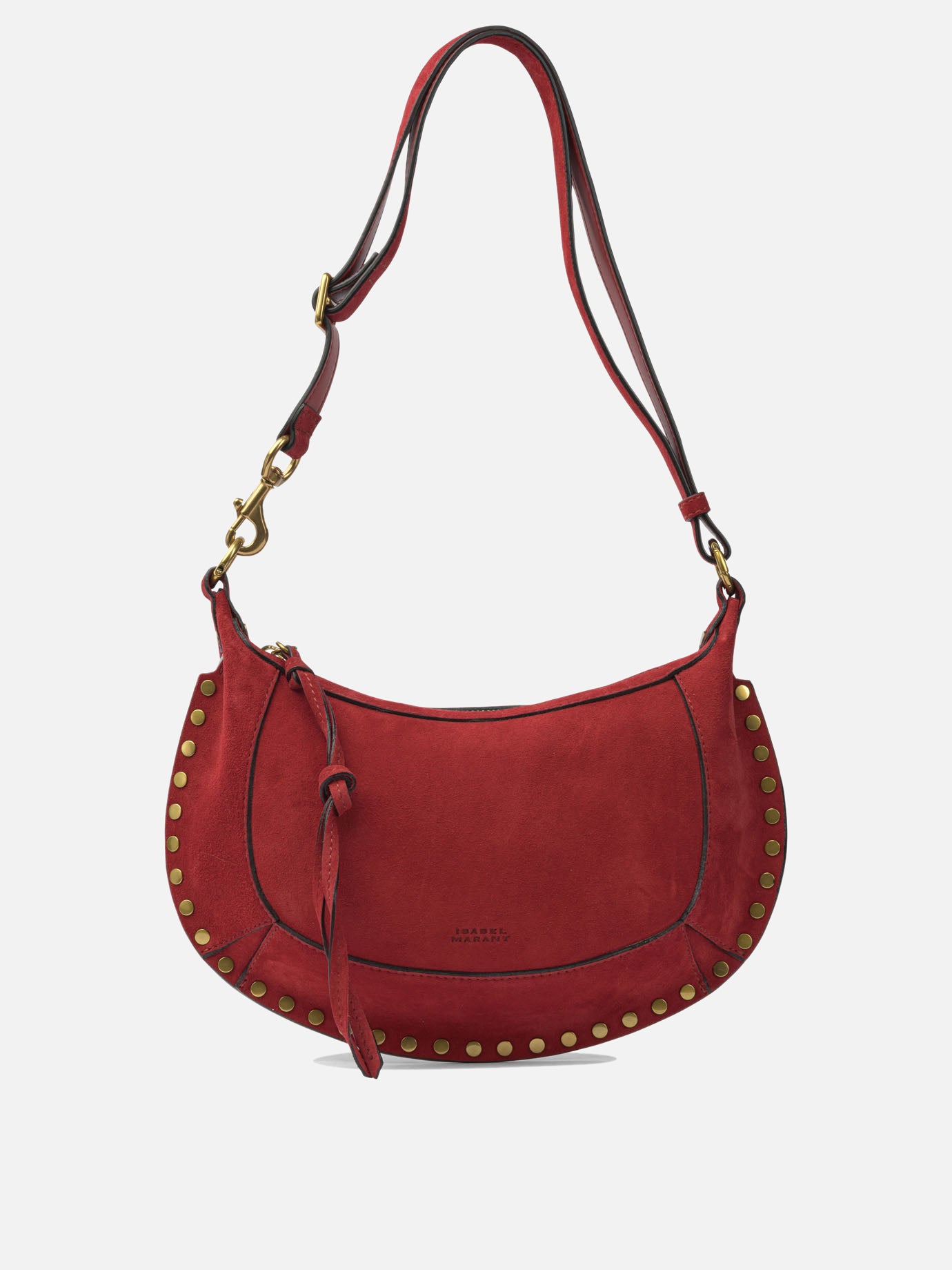 Isabel Marant "Oskan Moon" shoulder bag made of suede with a semi-rigid structure. The construction includes a curved silhouette with a rounded profile and application of studs across the surface. The shoulder strap is removable and adjustable, allowing different modes of use. Two interior compartments are organized by a zippered central divider. The Isabel Marant logo is embossed on the front.