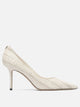 Jimmy Choo "Love 85 mm" pumps, a constructed model with calfskin upper and pointed silhouette. The structure is formed by a slim heel with a continuous leather overlay. The sole is hand-carved from leather, lending stability and definition to the profile. An applied button on the back bears the JC logo, an identifying element of the brand. The finish respects a precise line with no visible stitching.
