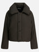 Lemaire down-filled down jacket constructed from a combination of linen and cotton treated to provide water-repellent properties. The structure is lined and quilted, with a straight-cut silhouette, cinched at the waist. The design includes a scoop neck fitted with a chin strap, front zipper and button closure, drawstring-adjusted hem, and side pockets with snap buttons.