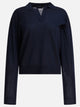 Soeur's "Fleming" sweater, constructed of fine-gauge merino wool, features an oversize silhouette with a straight fit. The construction features long sleeves and a polo collar. The lines are essential and the fine workmanship emphasizes the compactness of the fabric, ensuring a lightweight yet structured knit. No superfluous details interrupt the surface, enhancing the regularity of the knit.