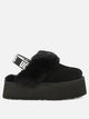 Ugg "Funkette" slipper, constructed with suede upper, features slip-on silhouette and compact structure. 10mm sheepskin lining that extends to the insole and collar. EVA outsole combines with a layered platform that characterizes the profile. Elastic back strap with Ugg graphics keeps the foot stable. The shape retains elements of the classic Coquette.